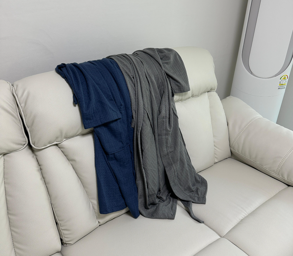 여름철 에어컨 바람이 강한 실내에서는 어깨에 살짝 걸쳐두고 사용하기도 하고, 아침에 잠에서 깨어나 바로 커피를 마시러 부엌으로 나갈 때도 이 가운을 슬쩍 걸치고 나오곤 합니다. 또한 재택근무를 할 때도 가벼운 홈웨어처럼 입고 있으면 편안하면서도 어느 정도 단정한 느낌을 유지할 수 있어요.